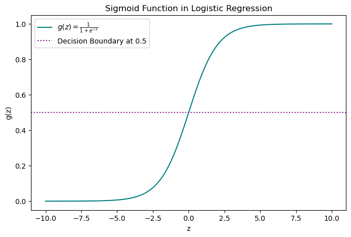 The decision boundary is where the probability equals 0.5. If the decision boundary is linear (a straight line accurately divides the data into two categories), the value of \(z\) takes on the linear regression expression. However, if the decision boundary is best described by some other function or more complex polynomial, then \(z\) will change accordingly. In this way, the sigmoid function can accommodate complex data patterns with decision boundaries that are non-linear.
