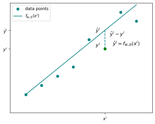 For any given sample \(i\), the predicted value is \(\hat{y}^{(i)} = f_{w,b}(x^{(i)})\). The actual measured value is \(y^{(i)}\). The difference between them is the error.
